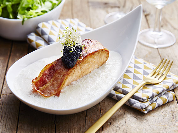 7. Démouler chaque tartelette de potimarron au centre d’une assiette, déposer un trait de vinaigrette autour et terminer par les Noix de St-Jacques.